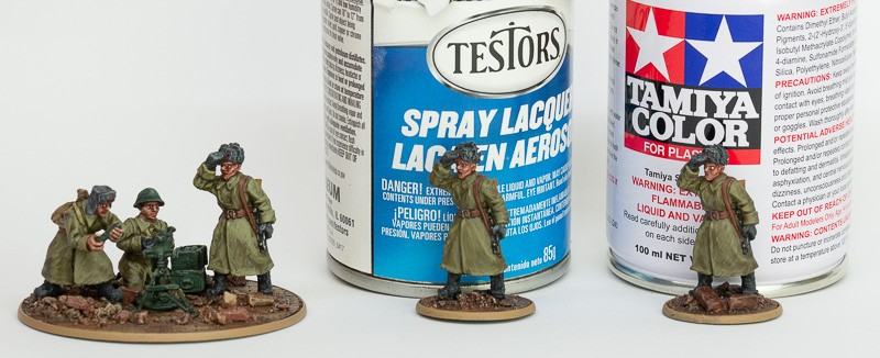 Having completed an entire podcast on clear-coat (here), I thought I would take Dan's advice an purchase a can of Tamiya TS-80 flat clear-coat. I gave it a try and it went well, having taken that medication (or placebo) I felt all better and have been enjoying the TS-80 flat and "not-so-much-colour-knockback" effect. Recently though I painted up 3 of the exact same mini and I thought it would be worth while doing a more objective test. Below are three soviet squad leaders looking out across the broken cityscape for danger in the form of enemy in grey. Click on the image for the supersized version. The minis are clear-coated as follows:
