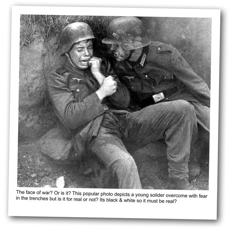 The face of war? Or is it? This popular photo depicts a young solider overcome with fear in the trenches but is it for real or not? Its black & white so it must be real...