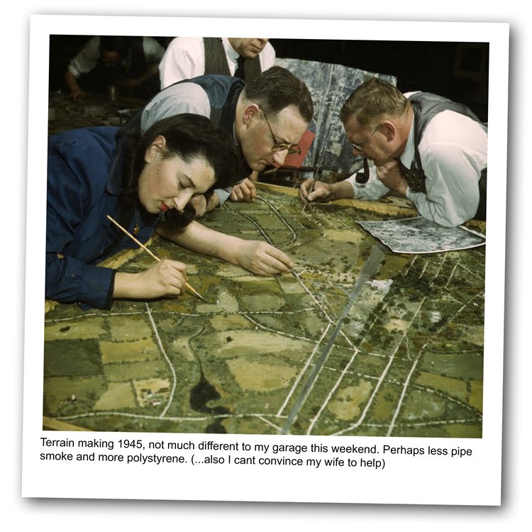 Terrain making 1945, not much different to my garage this weekend. Perhaps less pipe smoke and more polystyrene. (...also I can't convince my wife to help)