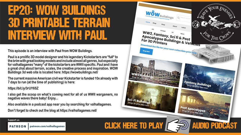 This episode is an interview with Paul from WOW Buildings. Paul is a prolific 3D model designer and his legendary Kickstarters are *full* to the brim with great looking models and include almost all genres, but especially for valhallagames *many* of the kickstarters are WWII specific. Paul and I have a great chat about terrain, scales, the creative process and inspiration.