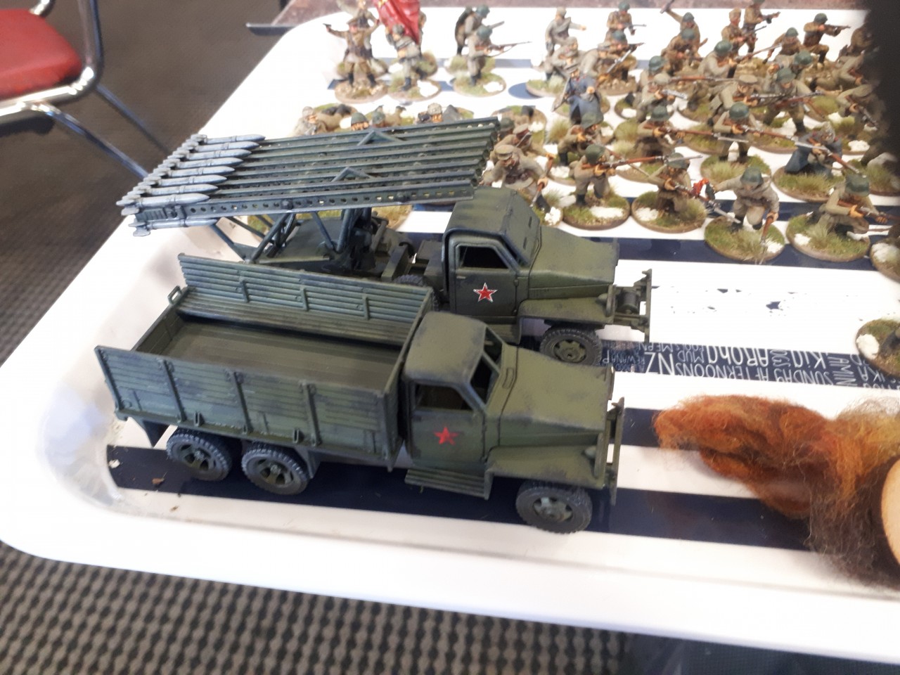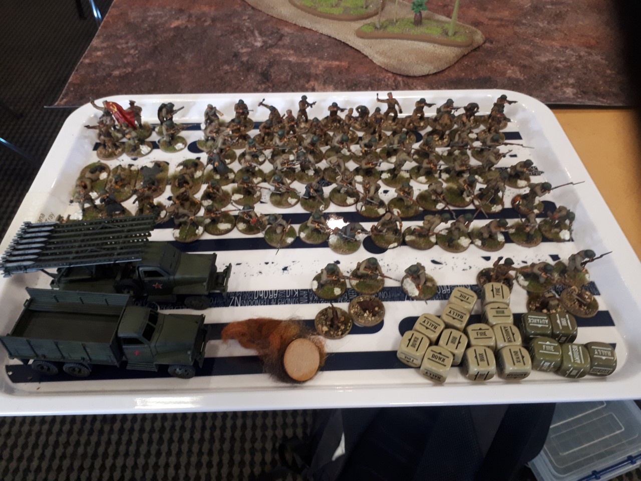 Heres a ( poor! ) pic of my Soviet army laid out, and then a a closer shot of the vehicles i received and painted to tabletop standard quickly to get onto the table for the event
