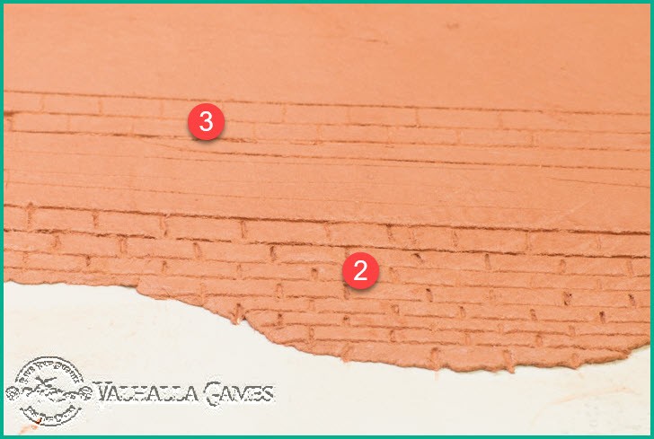 I used two different methods of sculpting some rough bricks, I have heard that people use both methods. Method A (2 in the image below) was a very rough try with a wooden cooking skewer (essentially a large wooden toothpick) immediately while the clay was still wet. Method B (3 in the image below) after 24 hours the clay was very dry (it's hot here currently) and the light, somewhat pathetic, scratches were made with a light duty craft knife and metal ruler.