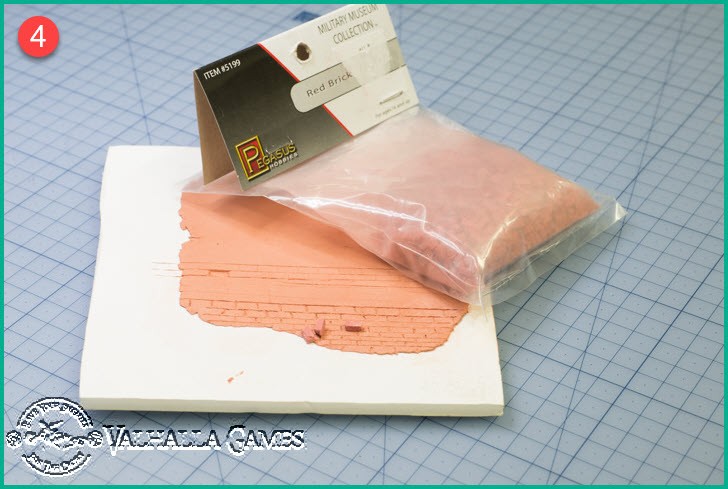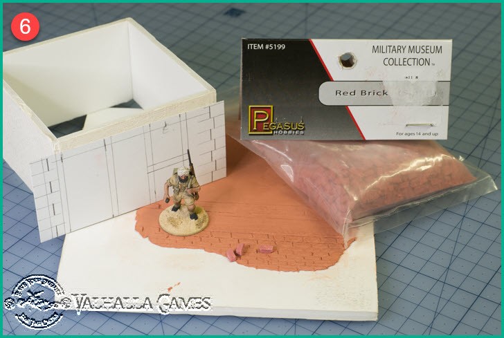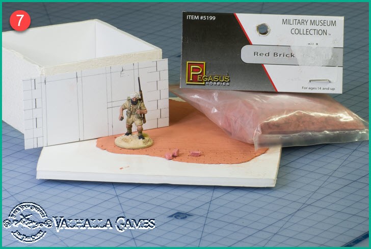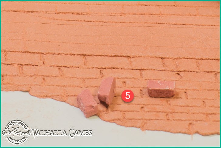 I made the brick engravings various sizes to try to work out what would look reasonable size-wise against the 28mm minis (not necessarily to scale). After thinking about final usage and working in with other configurations such as damaged walls with piles of bricks alongside I decided to purchase some precast bricks and look at what size they were. They have now arrived and a couple of sample bricks are shown in 4 and 5 below.