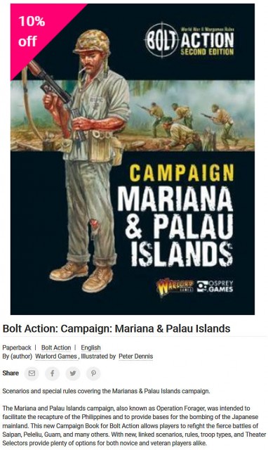 The Mariana and Palau Islands campaign, also known as Operation Forager, was intended to facilitate the recapture of the Philippines and to provide bases for the bombing of the Japanese mainland. This new Campaign Book for Bolt Action allows players to refight the fierce battles of Saipan, Peleliu, Guam, and many others. With new, linked scenarios, rules, troop types, and Theater Selectors provide plenty of options for both novice and veteran players alike.